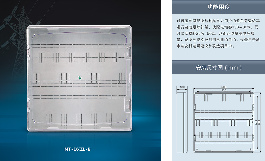 ,采用進口聚碳酸酯(PC)和阻燃ABS工程塑料制成。具有抗沖擊、抗老化、耐腐蝕、透明度高、抗紫外線、安裝方便等優點,并且具有用電安全保護,用戶分離控制,數據采集, 防盜電等功能。產品適合安裝電子式、機械式、智能IC卡預付式、智能多費率式電表。南騰NT系列透明